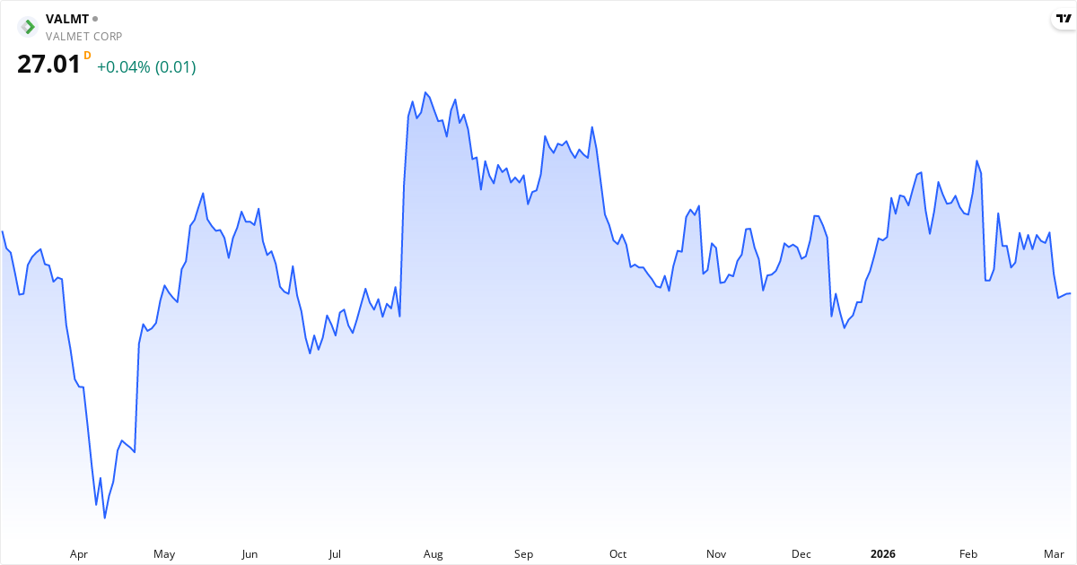 Valmet handlas till ett P/E på 17.8, vilket er nära markedsgenomsnittet. P/S-ratioen er 1.0 (lav — potentiellt undervärderad ift. omsättning). P/B er 1.9.