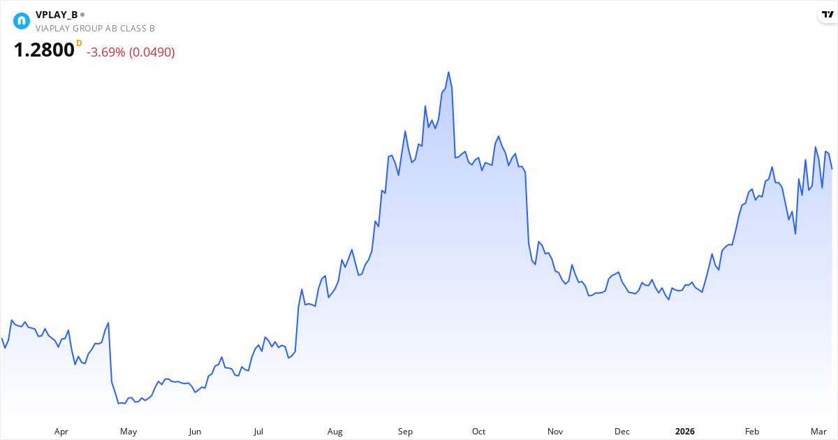 Den aktuella kursen är Kr.1.28, vilket placerar Viaplay Group AB Series B i kategorin övervärderad. Aktien bedöms som undervärderad, om kursen är under Kr.0.9, och som övervärderad, om kursen överstiger Kr.1.1.