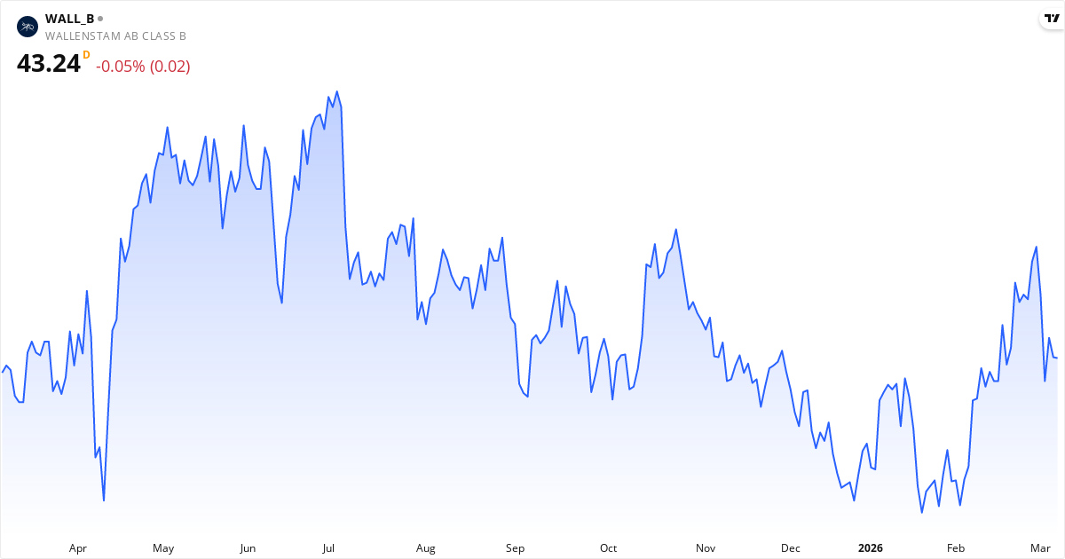 Den aktuella kursen är Kr.43.24, vilket placerar Wallenstam i kategorin övervärderad. Aktien bedöms som undervärderad, om kursen är under Kr.39.78, och som övervärderad, om kursen överstiger Kr.48.62.