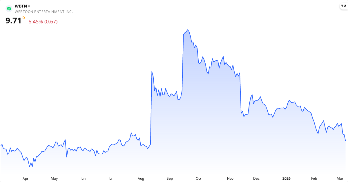 WEBTOON Entertainment aktiekurs – Kursutveckling 2026. Uppdaterad 08. Mar 2026.