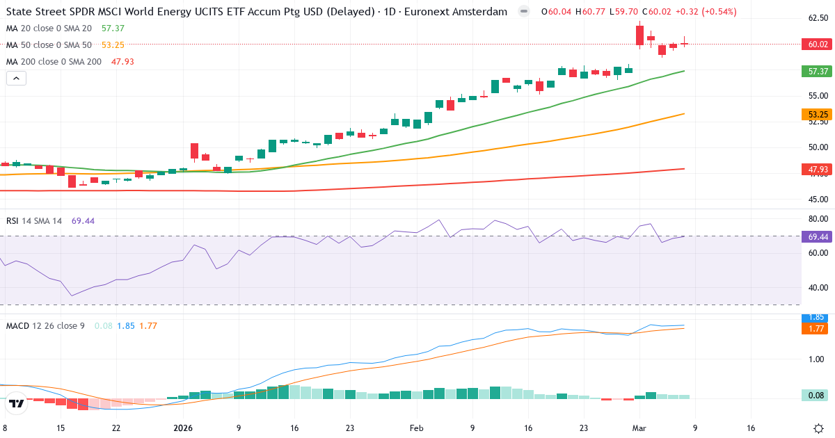 SPDR MSCI World Energy UCITS ETF's nästa rapportdatum är ännu inte tillgänglig. Se företagets finansiella kalender för mer information.Teknisk analys av SPDR MSCI World Energy UCITS ETF 2026 – Signal: Starkt Köp