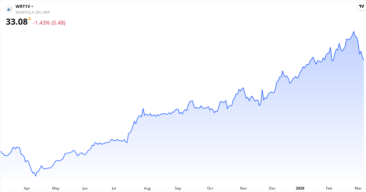 Wärtsilä Oyj Abp handlas till ett P/E på 31.7, vilket er över markedsgenomsnittet. Forward P/E er 29.9 (5% lägre), vilket indikerar at marknaden förväntar stigende intjäning. P/S-ratioen er 2.9. P/B er 7.1. PEG-ratioen er 4.79 — över 2.0 tyder på at aktien är dyr i förhållande tillväxtraten.