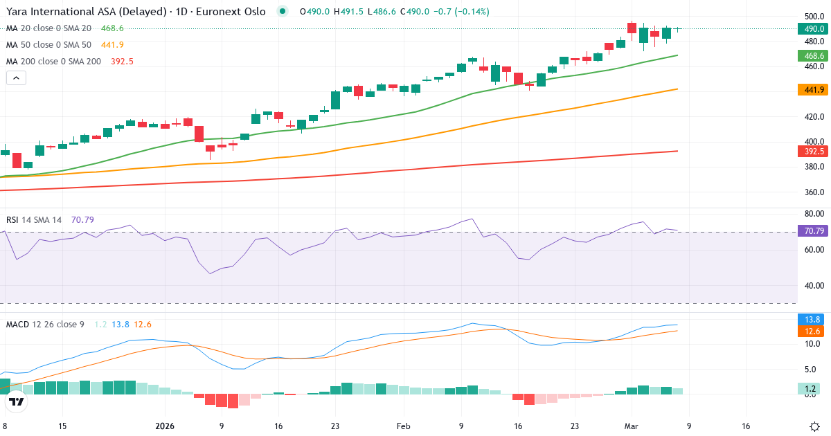 Yara International ASA er i en kortsigtet optrend. Kursen på 490.70 Kr. ligger 5.1% over 20-dages gennemsnittet (466.89 Kr.). På mellemlang sigt er billedet positivt: kursen ligger 11.4% over 50-dages gennemsnittet (440.34 Kr.). Langsigtet ligger aktien 25.3% over 200-dages gennemsnittet (391.72 Kr.), hvilket bekræfter en langsigtet optrend.