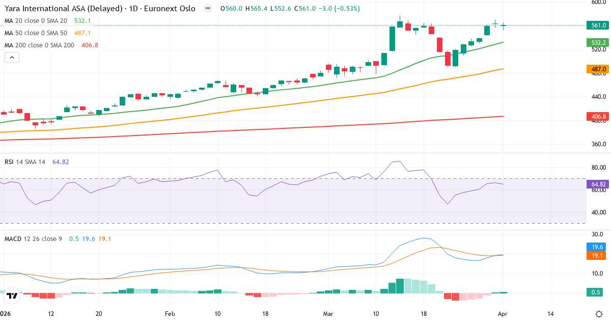 Yara International ASA er i en kortsigtet optrend. Kursen på 561.00 Kr. ligger 5.4% over 20-dages gennemsnittet (532.13 Kr.). På mellemlang sigt er billedet positivt: kursen ligger 15.2% over 50-dages gennemsnittet (487.11 Kr.). Langsigtet ligger aktien 37.9% over 200-dages gennemsnittet (406.77 Kr.), hvilket bekræfter en langsigtet optrend.