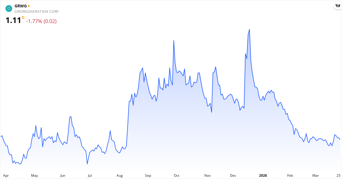 GrowGeneration aktiekurs – Kursudvikling 2026. Opdateret 28. Mar 2026.