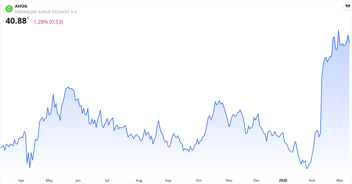 Koninklijke Ahold Delhaize handles til en P/E på 16.6, hvilket er tæt på markedsgennemsnittet. Forward P/E er 15.2 (8% lavere), hvilket indikerer at markedet forventer stigende indtjening. P/S-ratioen er 0.4 (lav — potentielt undervurderet ift. omsætning). P/B er 2.6. PEG-ratioen er 3.53 — over 2.0 tyder på at aktien er dyr i forhold til vækstraten.