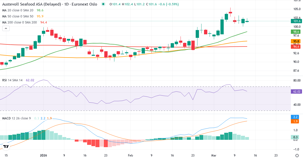 Golden Cross: 50-dages gennemsnittet (95.81) ligger over 200-dages (94.27), hvilket er et klassisk bullish signal for Austevoll Seafood ASA.