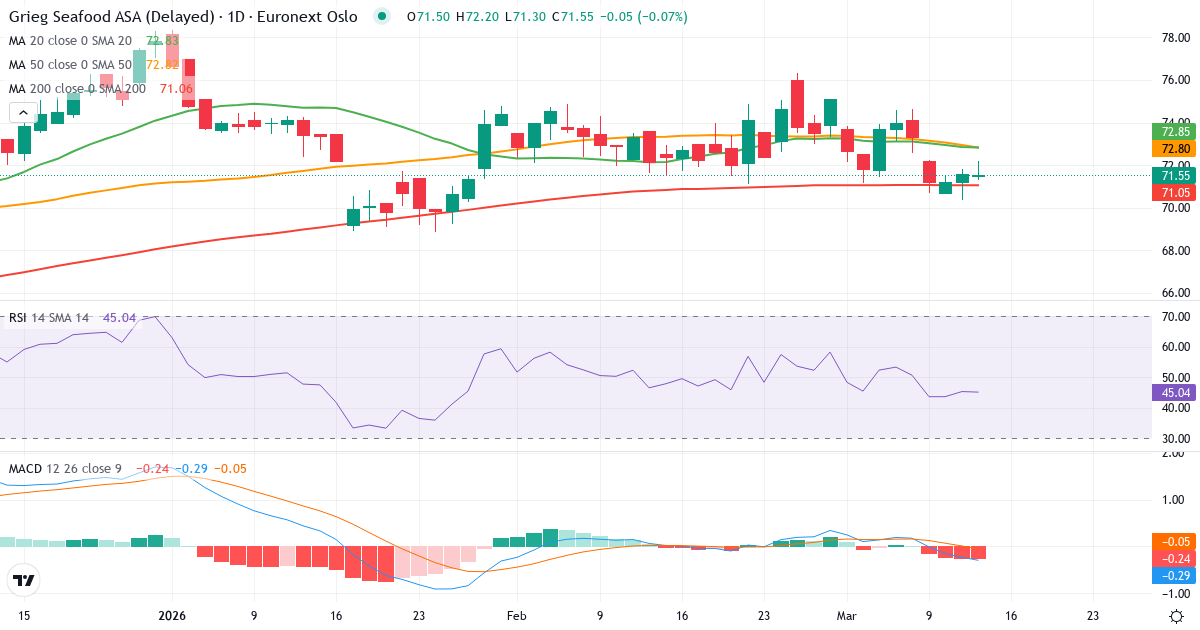 Golden Cross: 50-dages gennemsnittet (72.95) ligger over 200-dages (71.05), hvilket er et klassisk bullish signal for Grieg Seafood ASA.