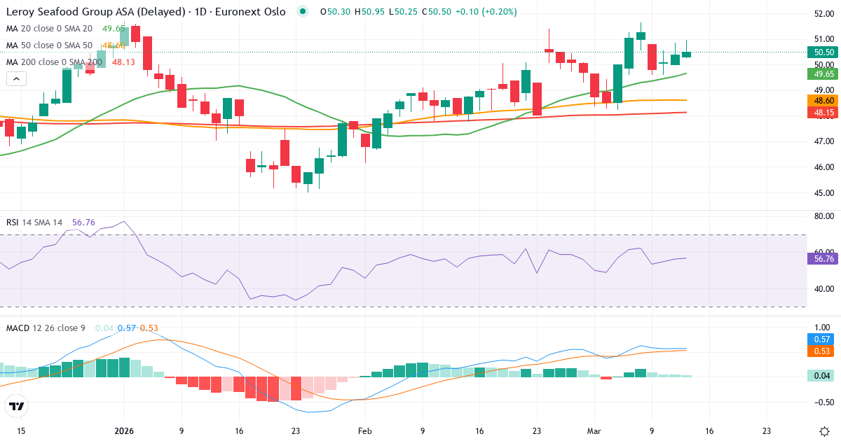 Golden Cross: 50-dages gennemsnittet (48.61) ligger over 200-dages (48.10), hvilket er et klassisk bullish signal for Lerøy Seafood Group ASA.