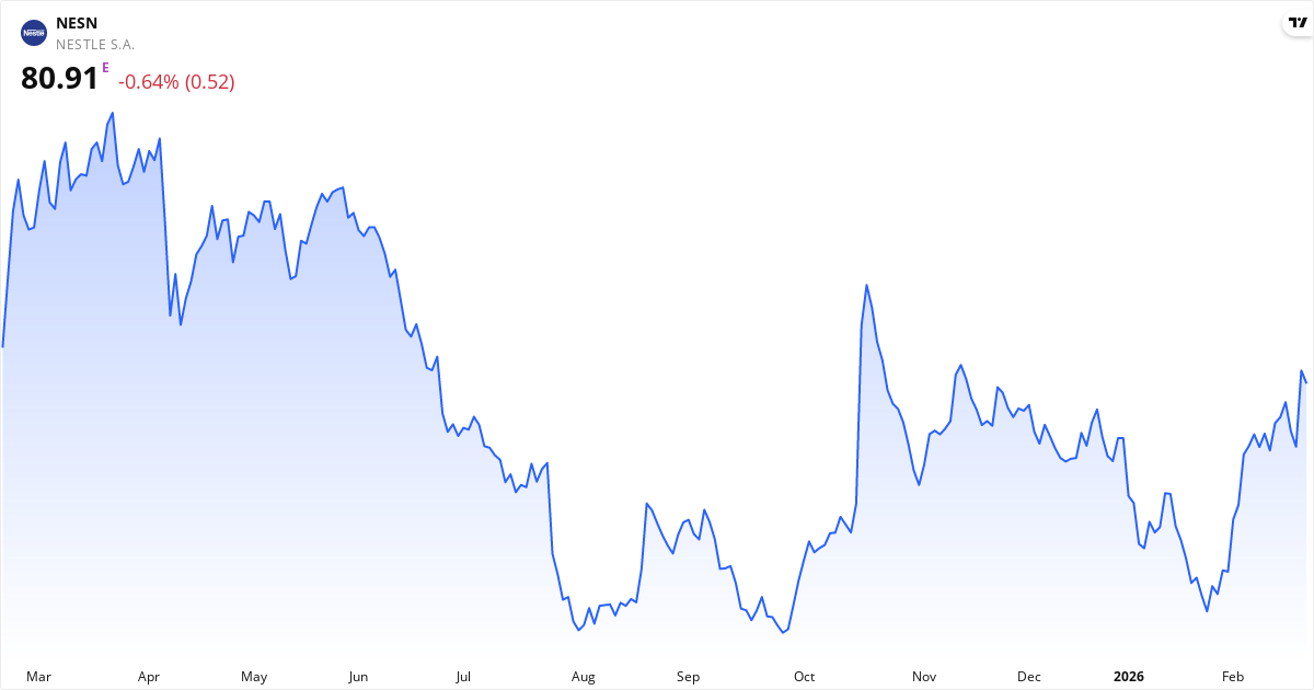 Nestlé har en overskudsgrad på 10.1% (solid) og en driftsmargin på 14.9%. ROE er 26.5% — fremragende afkast på egenkapitalen. ROA er 6.5%. Den seneste kvartalsindtjening voksede med -24.0% år-over-år — faldende indtjening.
