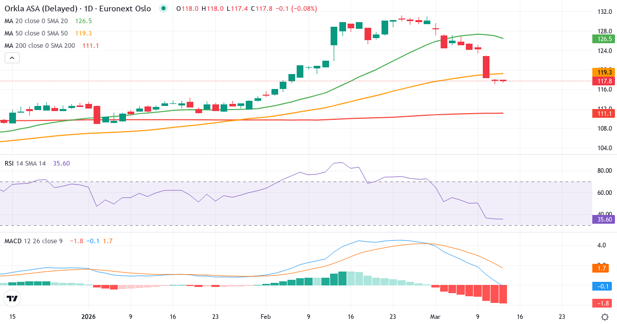 Orkla ASA er i en kortsigtet nedtrend. Kursen på 117.90 Kr. ligger 7.2% under 20-dages gennemsnittet (127.03 Kr.). På mellemlang sigt er billedet negativt: kursen ligger 1.1% under 50-dages gennemsnittet (119.15 Kr.). Langsigtet ligger aktien 6.1% over 200-dages gennemsnittet (111.10 Kr.), hvilket bekræfter en langsigtet optrend.