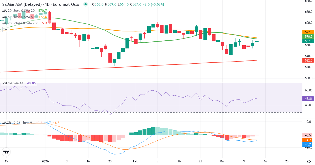 Golden Cross: 50-dages gennemsnittet (573.67) ligger over 200-dages (529.76), hvilket er et klassisk bullish signal for SalMar ASA.
