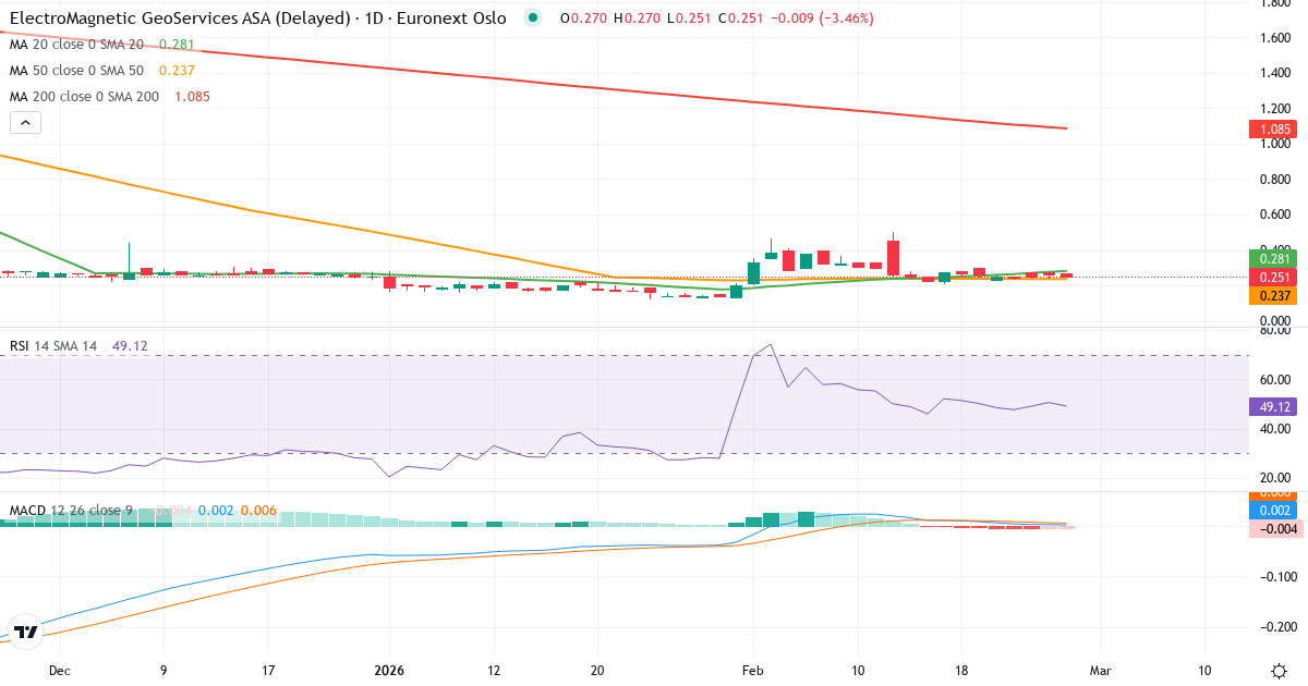 Death Cross: 50-dages gennemsnittet (0.24) ligger under 200-dages (1.09), hvilket er et klassisk bearish signal for Electromagnetic Geoservices ASA.