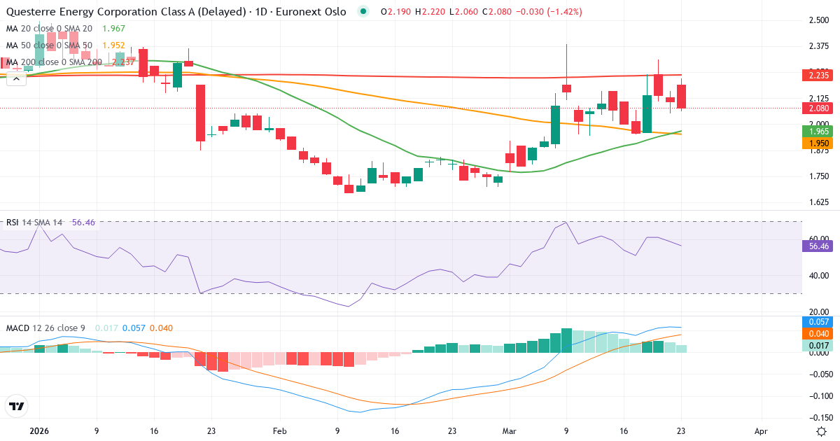 Death Cross: 50-dages gennemsnittet (1.96) ligger under 200-dages (2.24), hvilket er et klassisk bearish signal for Questerre Energy Corporation.