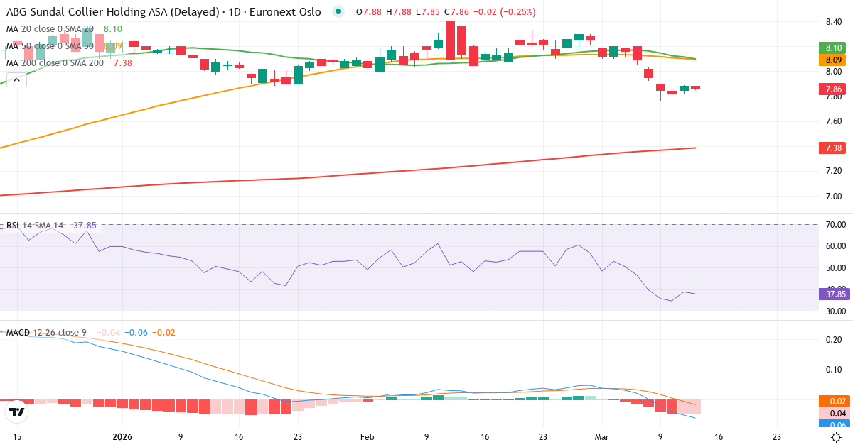 ABG Sundal Collier Holding ASA er i en kortsigtet nedtrend. Kursen på 7.88 Kr. ligger 2.9% under 20-dages gennemsnittet (8.11 Kr.). På mellemlang sigt er billedet negativt: kursen ligger 2.7% under 50-dages gennemsnittet (8.10 Kr.). Langsigtet ligger aktien 6.8% over 200-dages gennemsnittet (7.38 Kr.), hvilket bekræfter en langsigtet optrend.