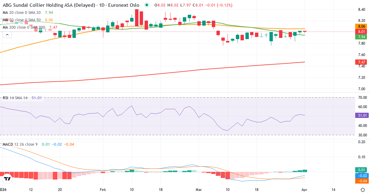 Golden Cross: 50-dages gennemsnittet (8.06) ligger over 200-dages (7.46), hvilket er et klassisk bullish signal for ABG Sundal Collier Holding ASA.