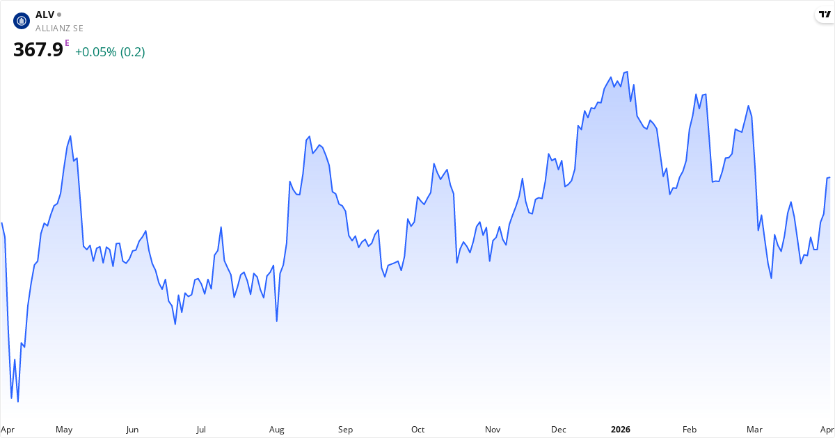 Den aktuelle kurs er €367.9, hvilket placerer Allianz i kategorien overvurderet. Aktien vurderes som undervurderet, hvis kursen er under €357.075, og som overvurderet, hvis kursen overstiger €436.425.