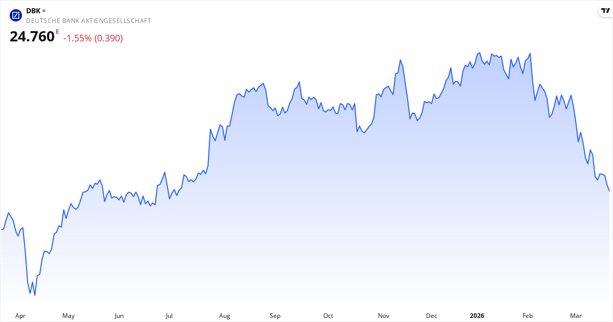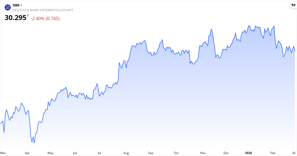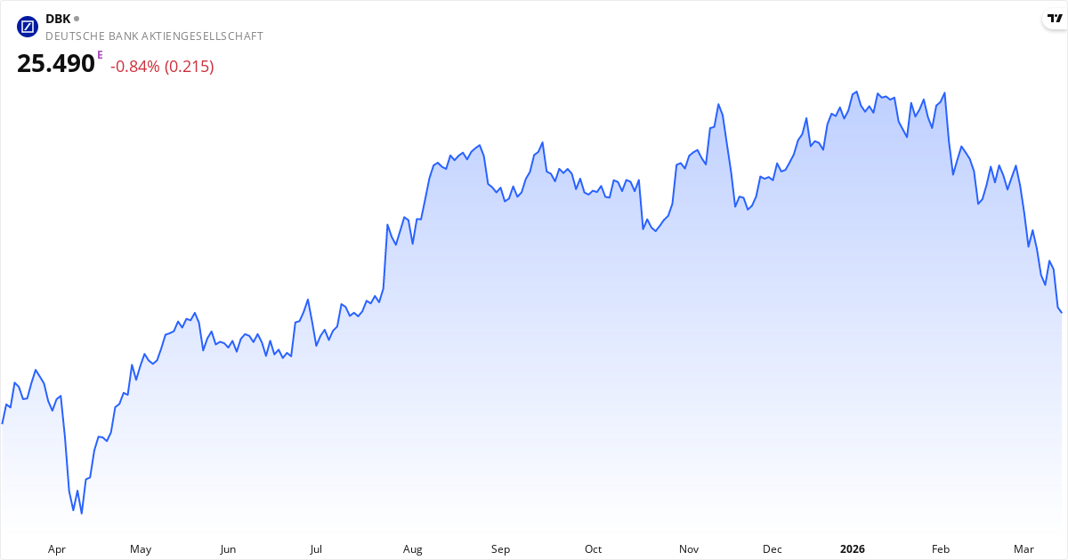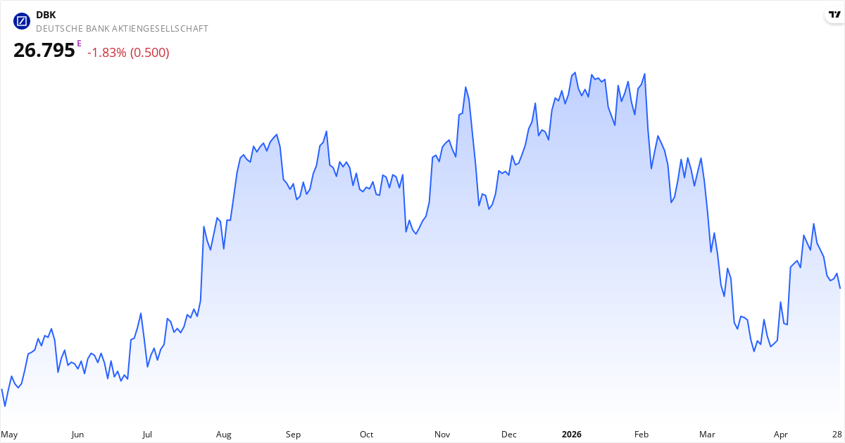 Deutsche Bank Aktiengesellschaft, eller DBK, driver en kæmpe forretning med finansielle ydelser globalt. De tjener primært penge på at servicere både private, virksomheder og store institutioner. I Corporate Bank-delen laver de blandt andet kasseløsninger og handelsfinansiering. Investment Bank-delen fokuserer på de store handler, som fusioner og opkøb, og de driver en del salg og handel med valuta. For private kunder tilbyder Deutsche Bank almindelige bankydelser, kreditprodukter og investeringsrådgivning, især inden for ESG. Desuden driver de en stor afdeling for Asset Management, hvor de investerer i alternativer som ejendomme og infrastruktur. De blev grundlagt i 1870 og har cirka 87.000 ansatte. Læs om virksomhedenNøgletal for Deutsche Bank Aktiengesellschaft