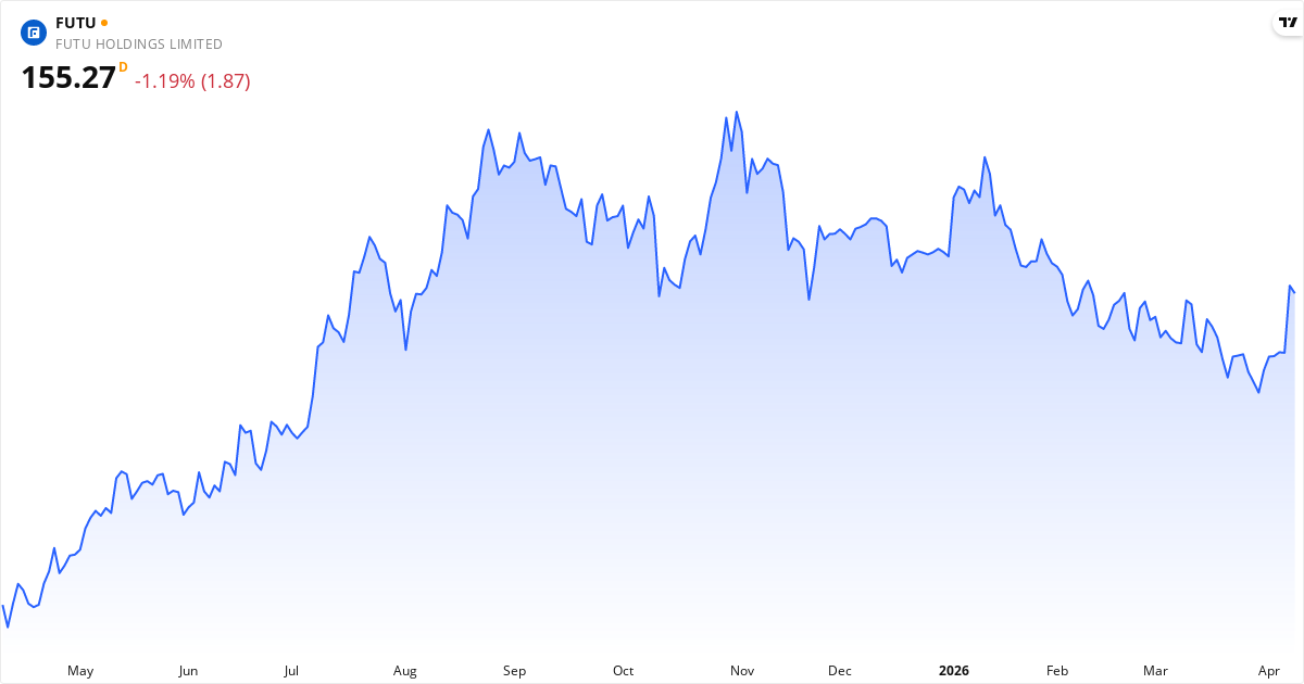 Futu offentliggør næste regnskab den 14. maj 2026. Aktien handles i øjeblikket til 155.27 $. Med et P/E-tal på 13.8 vil markedet holde øje med om indtjeningen lever op til forventningerne.