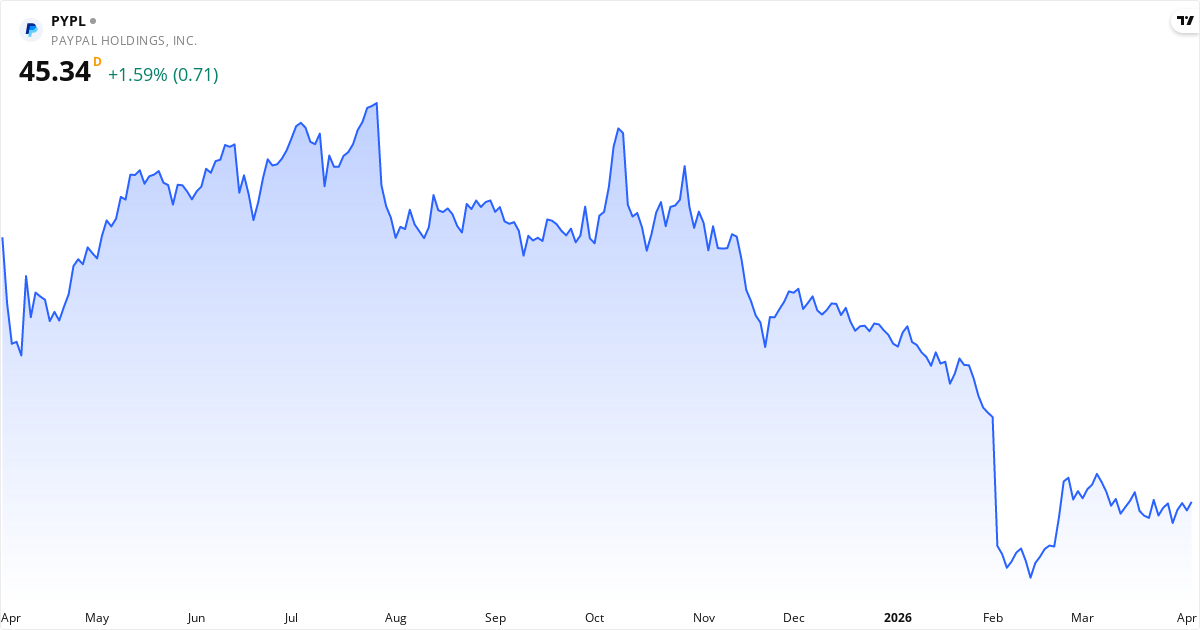 PayPal offentliggør næste regnskab den 05. maj 2026. Aktien handles i øjeblikket til 45.34 $. Med et P/E-tal på 8.4 vil markedet holde øje med om indtjeningen lever op til forventningerne.