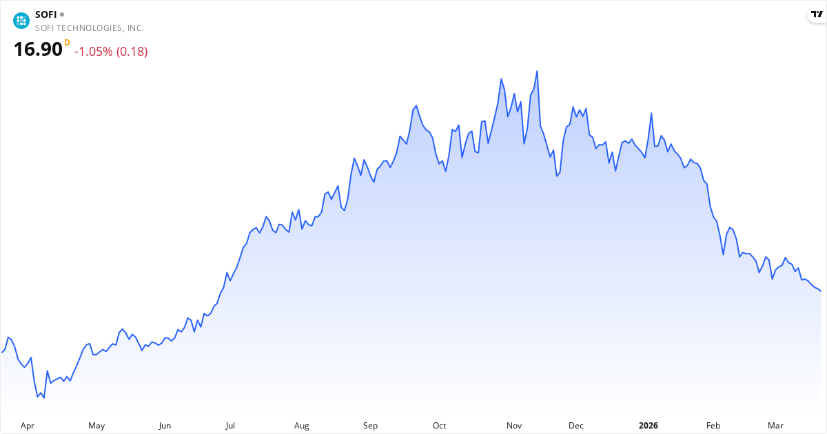 SoFi Technologies aktiekurs – Kursudvikling 2026. Opdateret 22. Mar 2026.