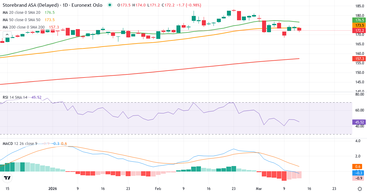 Storebrand ASA er i en kortsigtet nedtrend. Kursen på 173.90 Kr. ligger 1.6% under 20-dages gennemsnittet (176.77 Kr.). På mellemlang sigt er billedet positivt: kursen ligger 0.2% over 50-dages gennemsnittet (173.51 Kr.). Langsigtet ligger aktien 10.7% over 200-dages gennemsnittet (157.12 Kr.), hvilket bekræfter en langsigtet optrend.