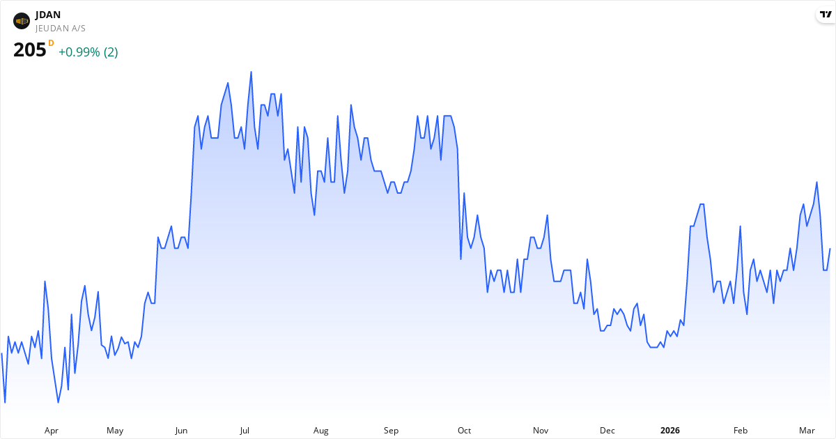 Jeudan aktiekurs – Kursudvikling 2026. Opdateret 12. Mar 2026.
