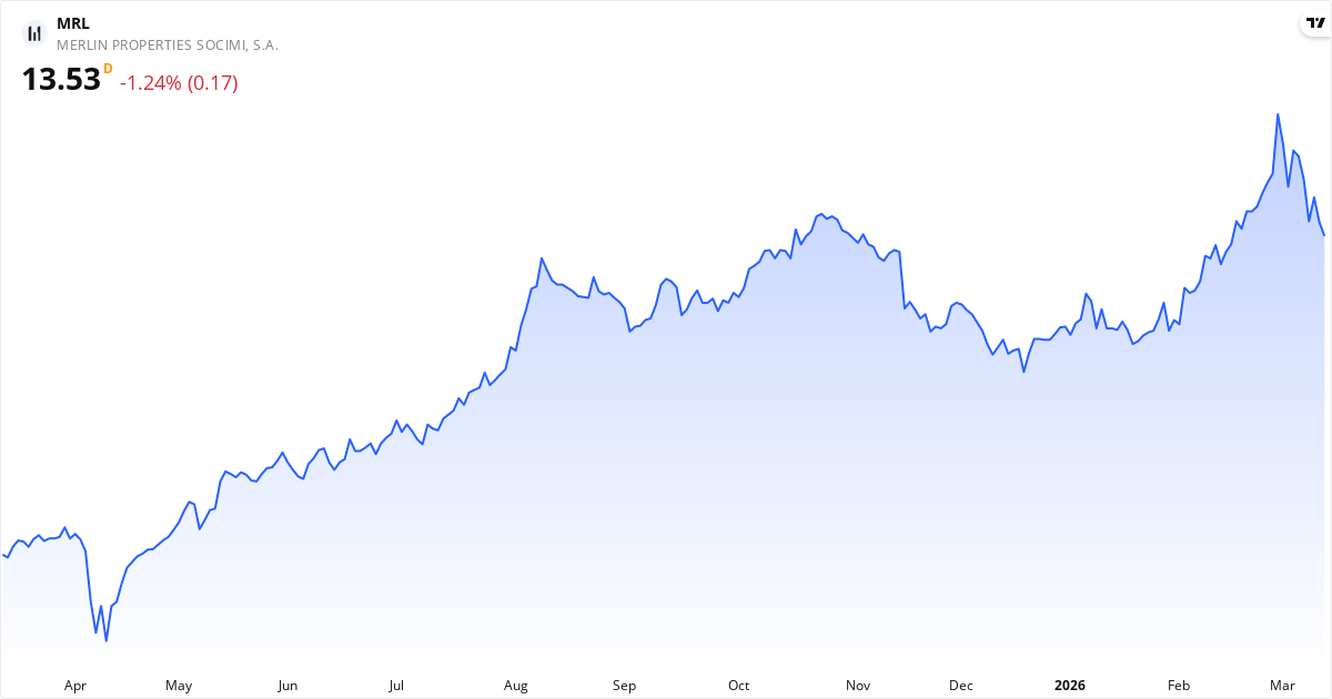 MERLIN Properties er Spaniens største ejendoms- og infrastrukturselskab på børsen. De tjener primært penge på at udvikle, købe og drive erhvervsejendomme i Spanien og Portugal. Virksomheden investerer i kontorer, shoppingcentre, logistikfaciliteter og datacentre. MERLIN Properties driver en stor portefølje, der dækker Core og Core Plus segmenterne. De er en vigtig spiller på markedet og indgår i det spanske IBEX-35 indeks. Samtidig er de noteret på flere store europæiske og globale ejendomsindeks. Virksomheden blev grundlagt i 2014 og er i dag en af de mest handlede i sektoren. De fokuserer på at skabe værdi gennem strategiske opkøb og aktiv styring af deres ejendomme. Læs om virksomhedenNøgletal for MERLIN Properties SOCIMI