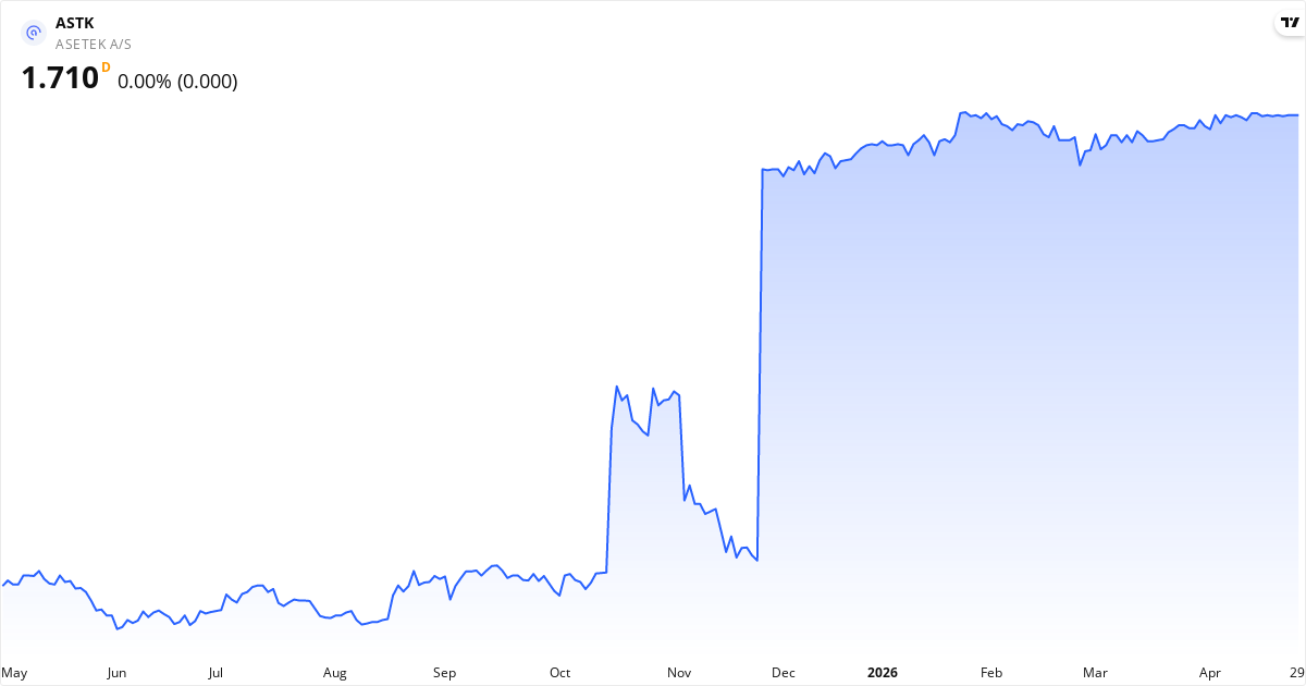 Asetek teknisk analyse – Candlestick-graf med RSI og MACD. Opdateret 29. Apr 2026.