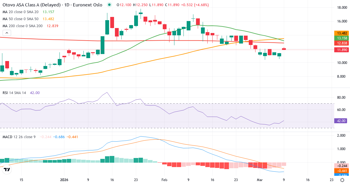 Golden Cross: 50-dages gennemsnittet (13.43) ligger over 200-dages (12.86), hvilket er et klassisk bullish signal for Otovo AS.