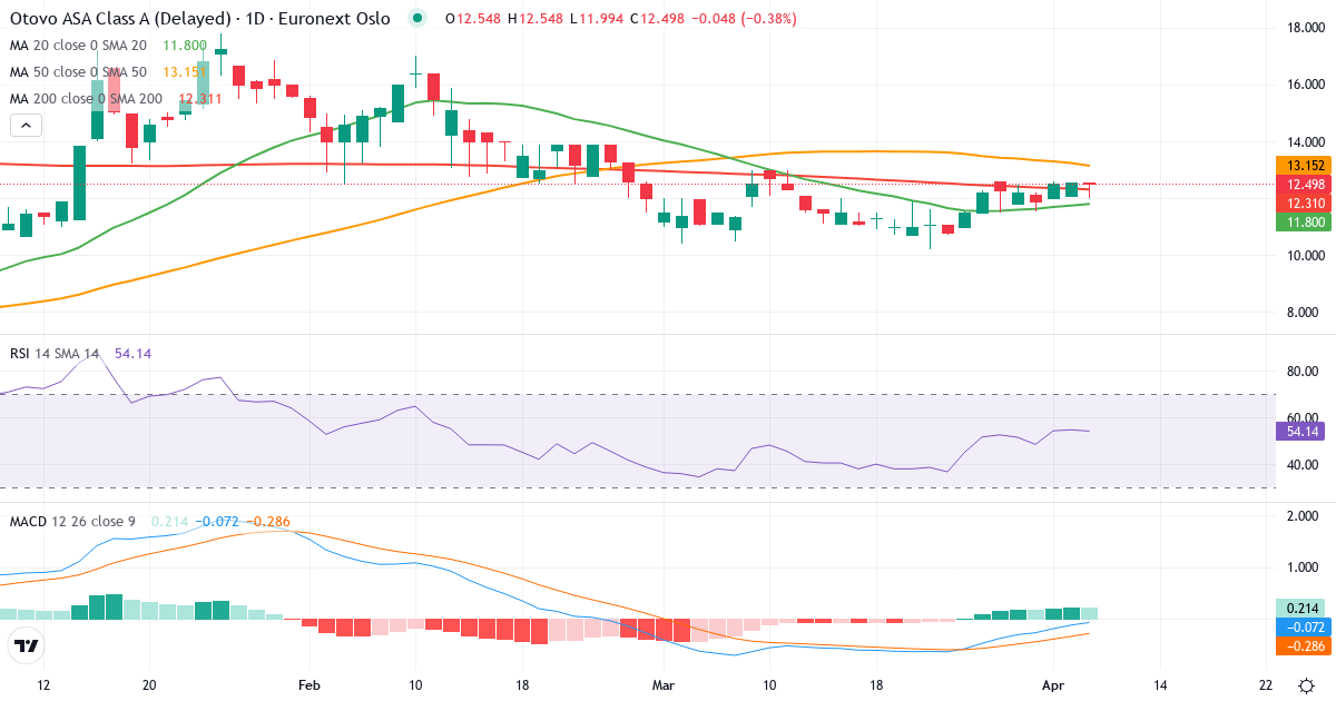 Otovo AS er i en kortsigtet optrend. Kursen på 12.48 Kr. ligger 5.8% over 20-dages gennemsnittet (11.80 Kr.). På mellemlang sigt er billedet negativt: kursen ligger 5.1% under 50-dages gennemsnittet (13.15 Kr.). Langsigtet ligger aktien 1.4% over 200-dages gennemsnittet (12.31 Kr.), hvilket bekræfter en langsigtet optrend.