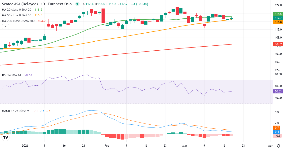 Scatec ASA er i en kortsigtet nedtrend. Kursen på 117.30 Kr. ligger 0.9% under 20-dages gennemsnittet (118.42 Kr.). På mellemlang sigt er billedet positivt: kursen ligger 0.6% over 50-dages gennemsnittet (116.64 Kr.). Langsigtet ligger aktien 12.2% over 200-dages gennemsnittet (104.52 Kr.), hvilket bekræfter en langsigtet optrend.