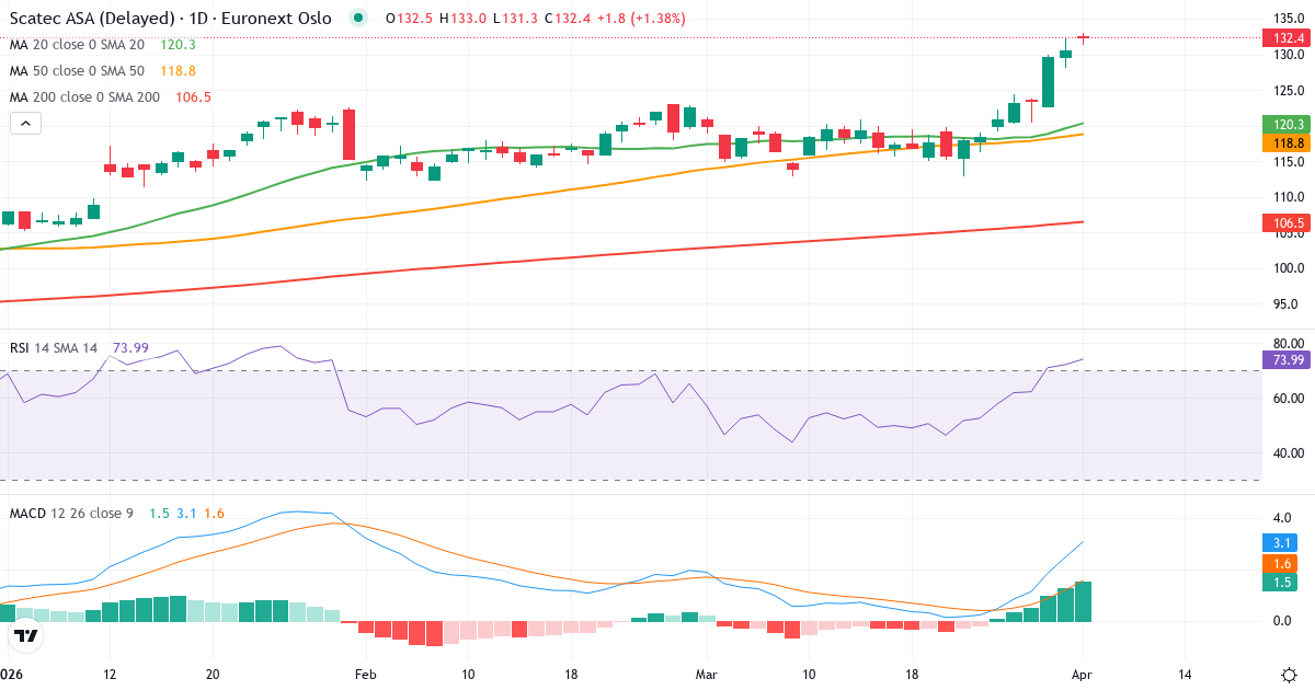 Scatec ASA er i en kortsigtet optrend. Kursen på 130.60 Kr. ligger 9.2% over 20-dages gennemsnittet (119.58 Kr.). På mellemlang sigt er billedet positivt: kursen ligger 10.3% over 50-dages gennemsnittet (118.46 Kr.). Langsigtet ligger aktien 22.9% over 200-dages gennemsnittet (106.25 Kr.), hvilket bekræfter en langsigtet optrend.
