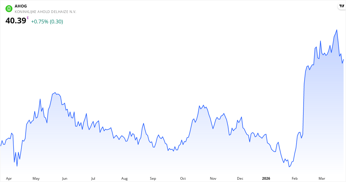 Koninklijke Ahold Delhaize handles til en P/E på 16.0, hvilket er tæt på markedsgennemsnittet. Forward P/E er 14.9 (7% lavere), hvilket indikerer at markedet forventer stigende indtjening. P/S-ratioen er 0.4 (lav — potentielt undervurderet ift. omsætning). P/B er 2.5. PEG-ratioen er 3.48 — over 2.0 tyder på at aktien er dyr i forhold til vækstraten.