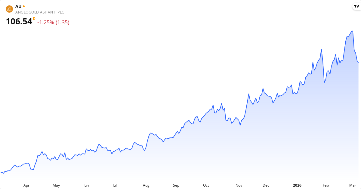 AngloGold Ashanti aktiekurs – Kursudvikling 2026. Opdateret 10. Mar 2026.