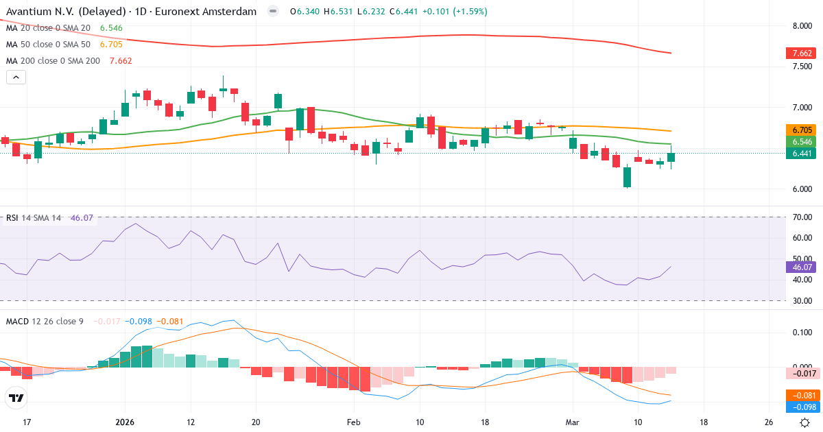 Death Cross: 50-dages gennemsnittet (6.71) ligger under 200-dages (7.66), hvilket er et klassisk bearish signal for Avantium N.V.