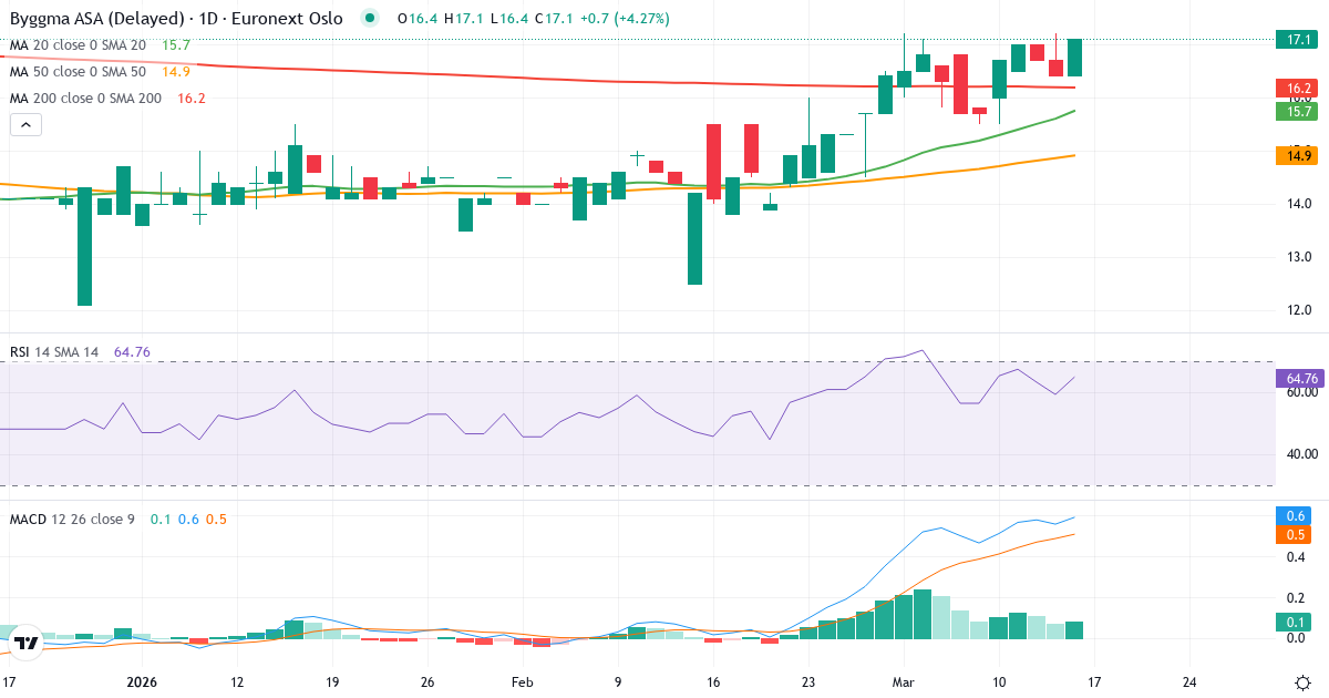 Byggma ASA er i en kortsigtet optrend. Kursen på 16.40 Kr. ligger 4.7% over 20-dages gennemsnittet (15.67 Kr.). På mellemlang sigt er billedet positivt: kursen ligger 10.3% over 50-dages gennemsnittet (14.87 Kr.). Langsigtet ligger aktien 2.0% over 200-dages gennemsnittet (16.07 Kr.), hvilket bekræfter en langsigtet optrend.