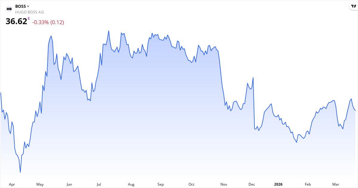 Den aktuelle kurs er €36.62, hvilket placerer Hugo Boss i kategorien overvurderet. Aktien vurderes som undervurderet, hvis kursen er under €35.442, og som overvurderet, hvis kursen overstiger €43.318.