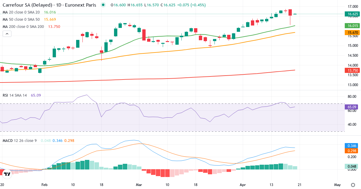 Golden Cross: 50-dages gennemsnittet (15.63) ligger over 200-dages (13.73), hvilket er et klassisk bullish signal for Carrefour SA.