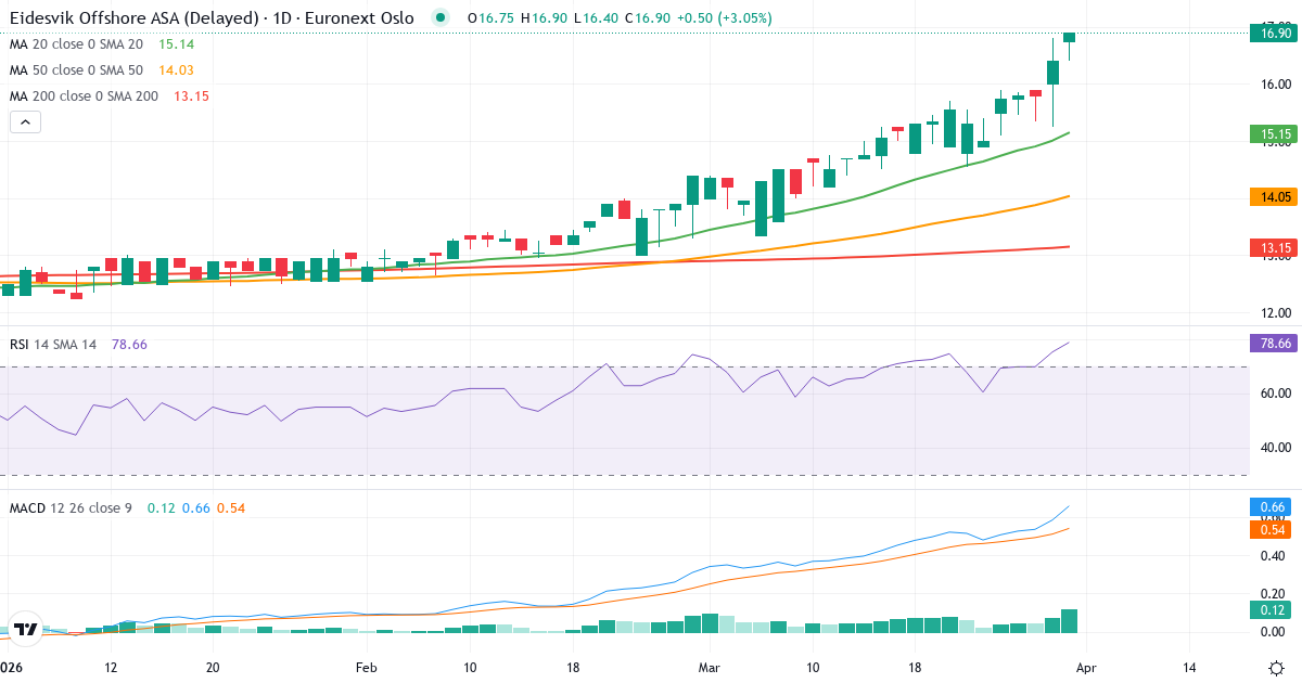 Eidesvik Offshore ASA har en RSI på 75.2, hvilket placerer aktien i overkøbt territorium (over 70). Selvom aktien er overkøbt, er den overordnede trend positiv. En kortvarig korrektion er mulig, men trenden støtter fortsat kursen.