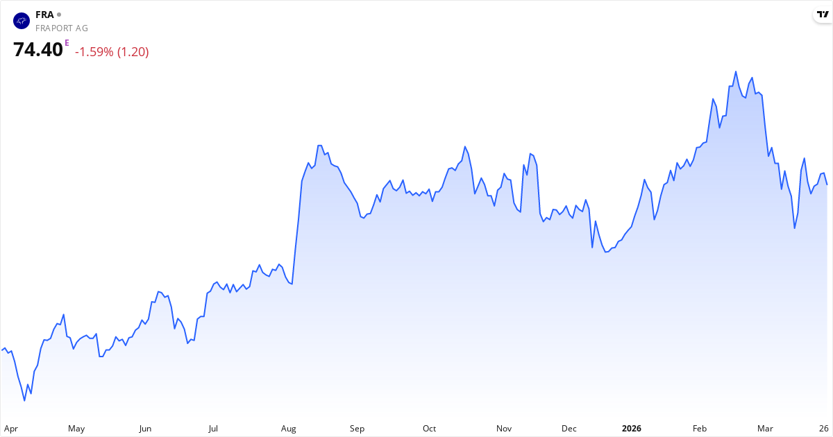 Kursudvikling for Fraport (FRA.XETRA) – aktiekurs på 74.40 €, marts 2026