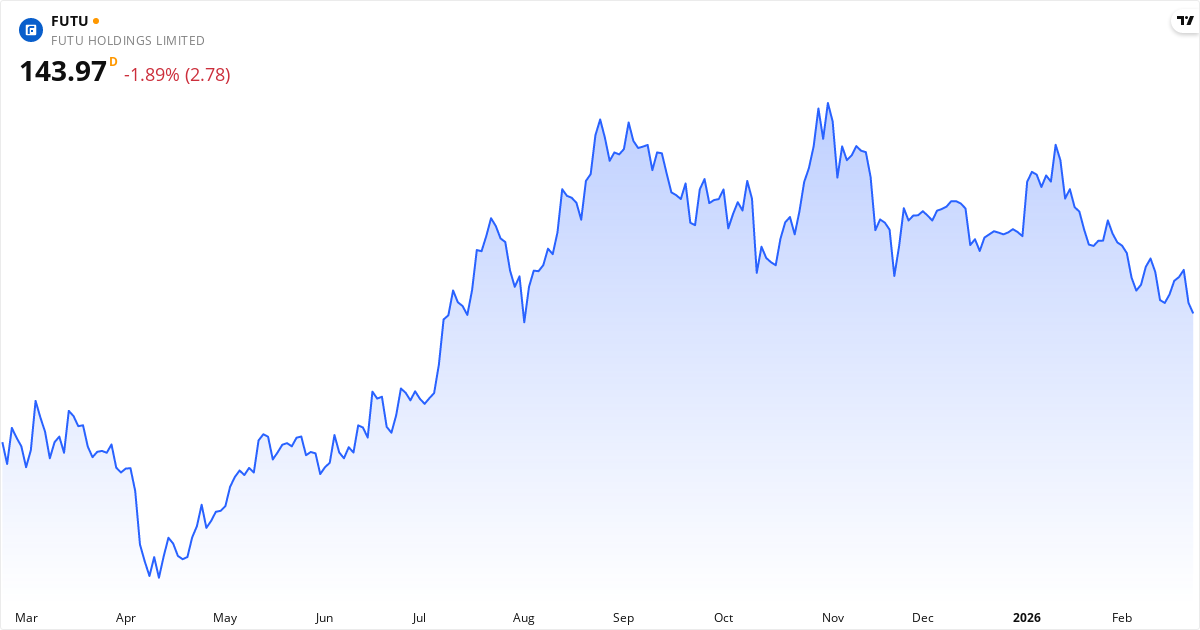 Futu handles til en P/E på 16.5, hvilket er tæt på markedsgennemsnittet. Forward P/E er 12.0 (27% lavere), hvilket indikerer at markedet forventer stigende indtjening. P/S-ratioen er 1.1. P/B er 5.4.