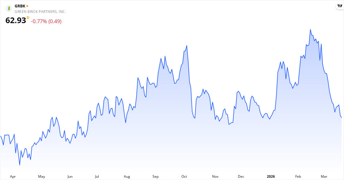 Green Brick Partners aktiekurs – Kursudvikling 2026. Opdateret 21. Mar 2026.