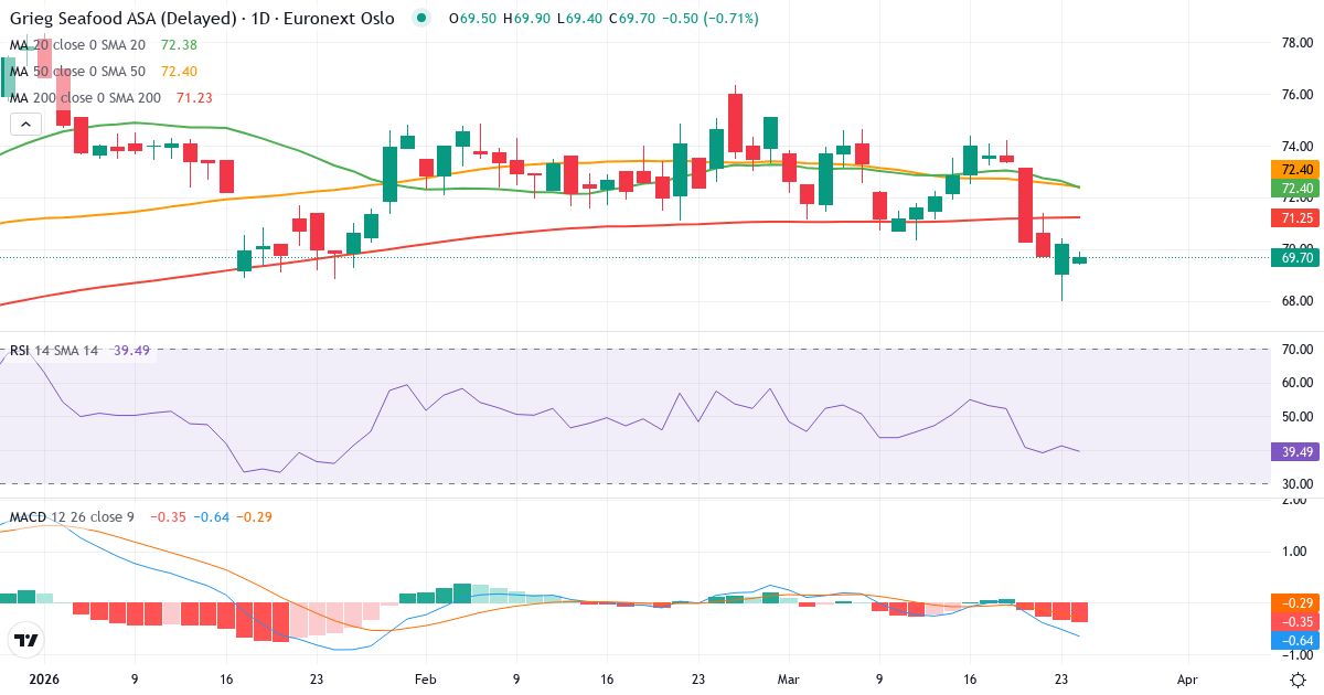 Golden Cross: 50-dages gennemsnittet (72.41) ligger over 200-dages (71.24), hvilket er et klassisk bullish signal for Grieg Seafood ASA.
