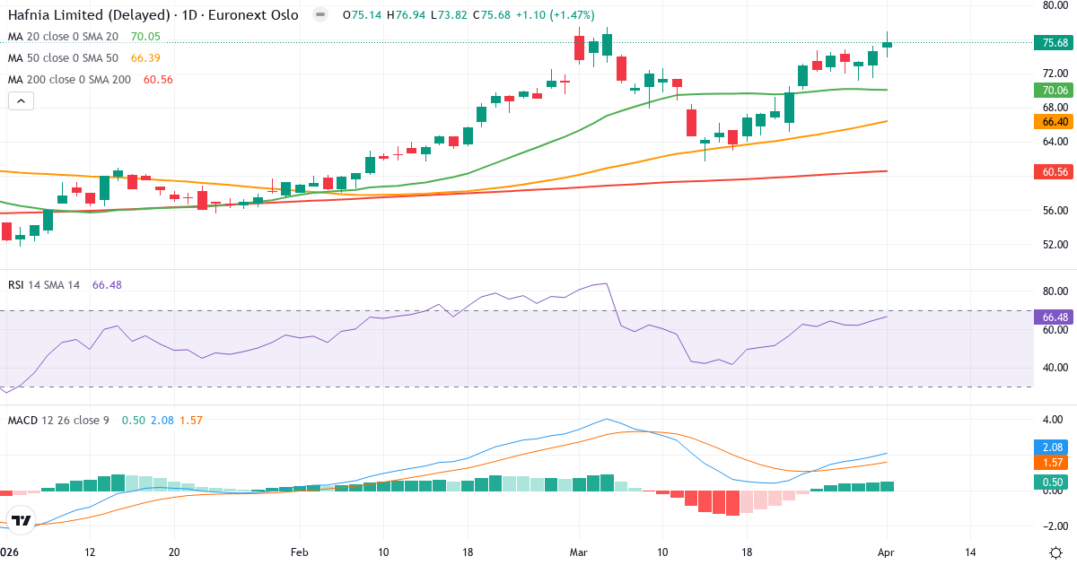 Golden Cross: 50-dages gennemsnittet (65.54) ligger over 200-dages (58.21), hvilket er et klassisk bullish signal for Hafnia Limited.