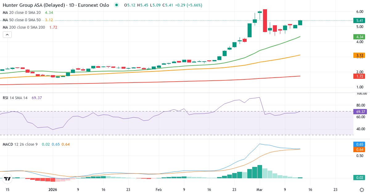 Hunter Group ASA er i en kortsigtet optrend. Kursen på 5.12 Kr. ligger 26.7% over 20-dages gennemsnittet (4.04 Kr.). På mellemlang sigt er billedet positivt: kursen ligger 77.5% over 50-dages gennemsnittet (2.88 Kr.). Langsigtet ligger aktien 240.7% over 200-dages gennemsnittet (1.50 Kr.), hvilket bekræfter en langsigtet optrend.
