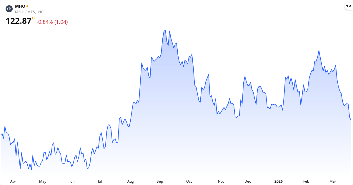 M/I Homes aktiekurs – Kursudvikling 2026. Opdateret 20. Mar 2026.