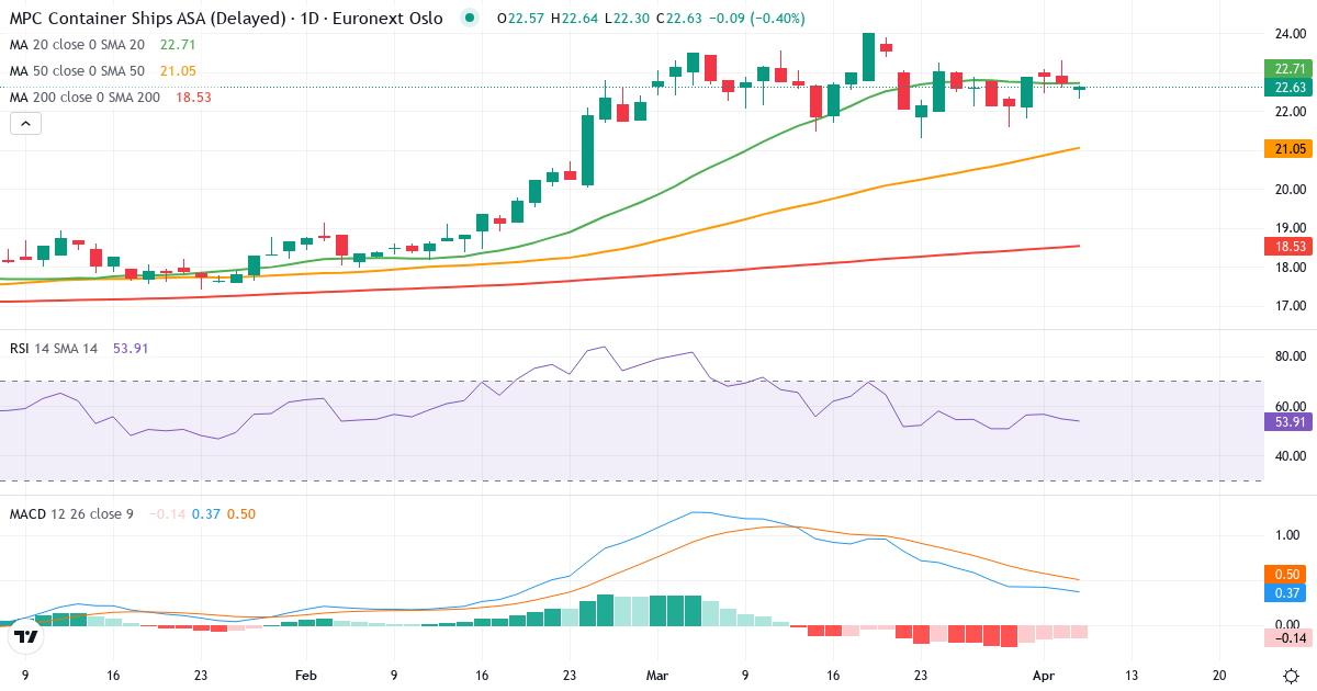 MPC Container Ships ASA er i en kortsigtet optrend. Kursen på 22.72 Kr. ligger 1.1% over 20-dages gennemsnittet (22.47 Kr.). På mellemlang sigt er billedet positivt: kursen ligger 10.2% over 50-dages gennemsnittet (20.62 Kr.). Langsigtet ligger aktien 28.5% over 200-dages gennemsnittet (17.69 Kr.), hvilket bekræfter en langsigtet optrend.