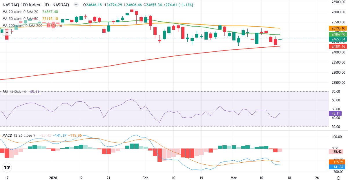 Golden Cross: 50-dages gennemsnittet (25,206.99) ligger over 200-dages (24,284.44), hvilket er et klassisk bullish signal for Nasdaq 100.