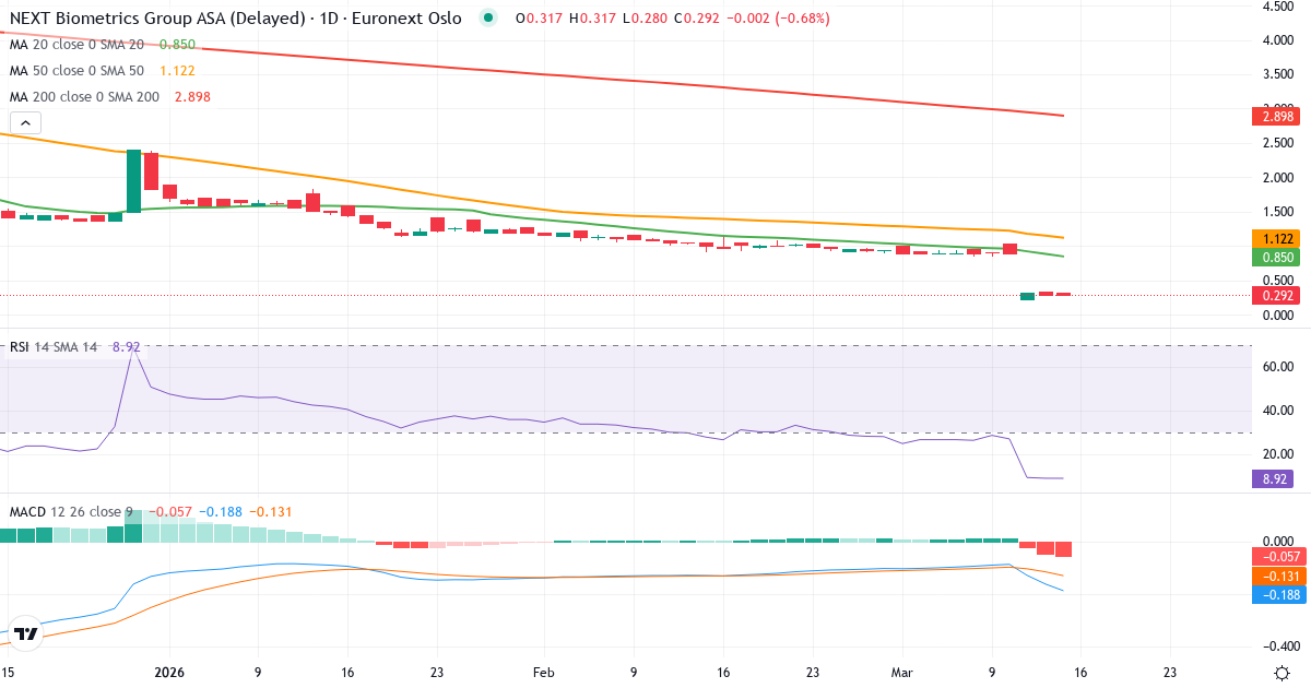 Death Cross: 50-dages gennemsnittet (1.15) ligger under 200-dages (2.92), hvilket er et klassisk bearish signal for NEXT Biometrics Group ASA.